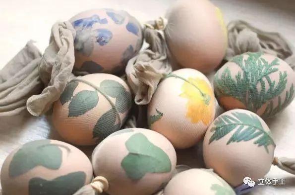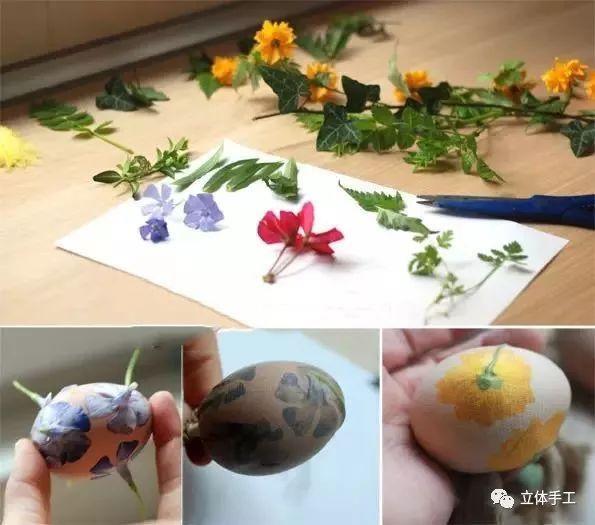 然后把鸡蛋放进染料水里面。最后,把鸡蛋取出来,把纱布和植物取下来,蛋壳上就会印有植物花草的图案哦~
