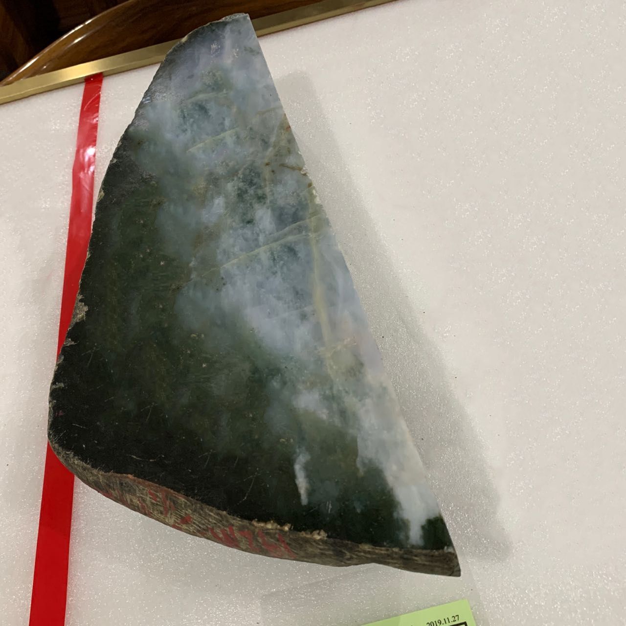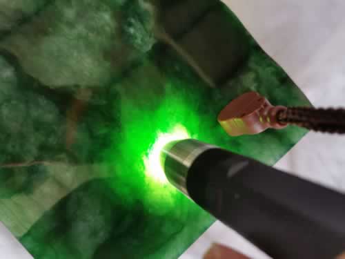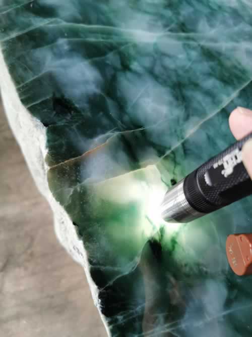 这是鉴别翡翠原石的最基本方法,用小电筒强光照射原石表面,观察原石皮壳四周及内部的色调,真翡翠原石色调艳丽自然,绿色走向清楚,光泽强,反光亮,与周围部分呈渐变关系,假翡翠原石赌石则相反。