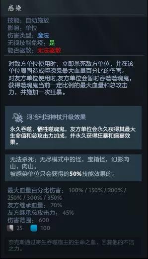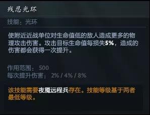 夜魇近战,近战单位攻击时根据目标血量,获得伤害加成,每降低5%获得8%加成(满级) ,夜魇远程,远程单位获得200%爆伤加成。