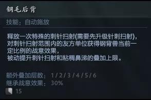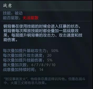 钢背兽可以把自身的战意层数给予友军,但是只会给50%效果,五星天赋点了之后就可以全额,战意的效果(满星满级)是提升攻击650% ,65%技能伤,以及大量攻速,一些技能和攻击挂钩的主C比较匹配,一般用来顶替冰女的位置,与伐木机一样也比较吃等级和星级。
