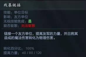 残暴熊怪的一技能可以将自己与另一个单位连接,被连接的单位提升小额的力量,并使其造成的所有魔法伤害转化为物理伤,转化率100%,附加部分力量。