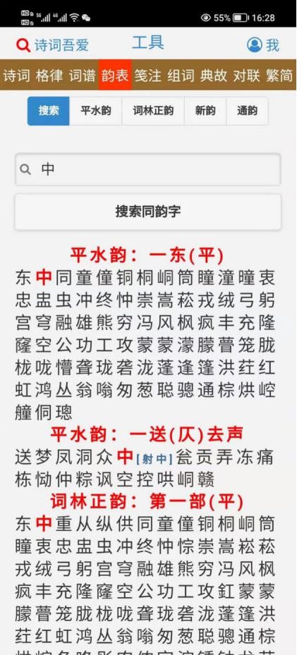 以下是在“诗词吾爱App”的“韵表”栏目所查到的,“中”字所在的韵部。