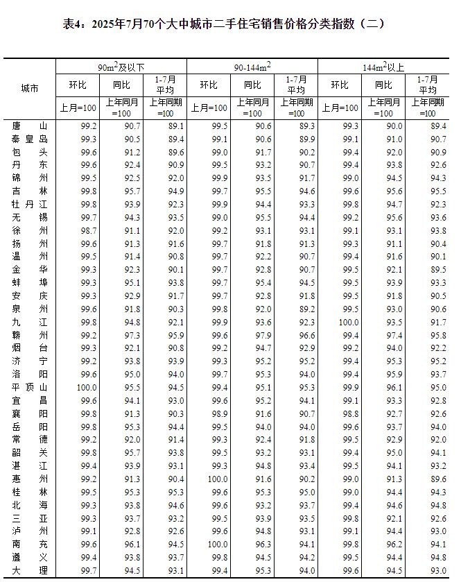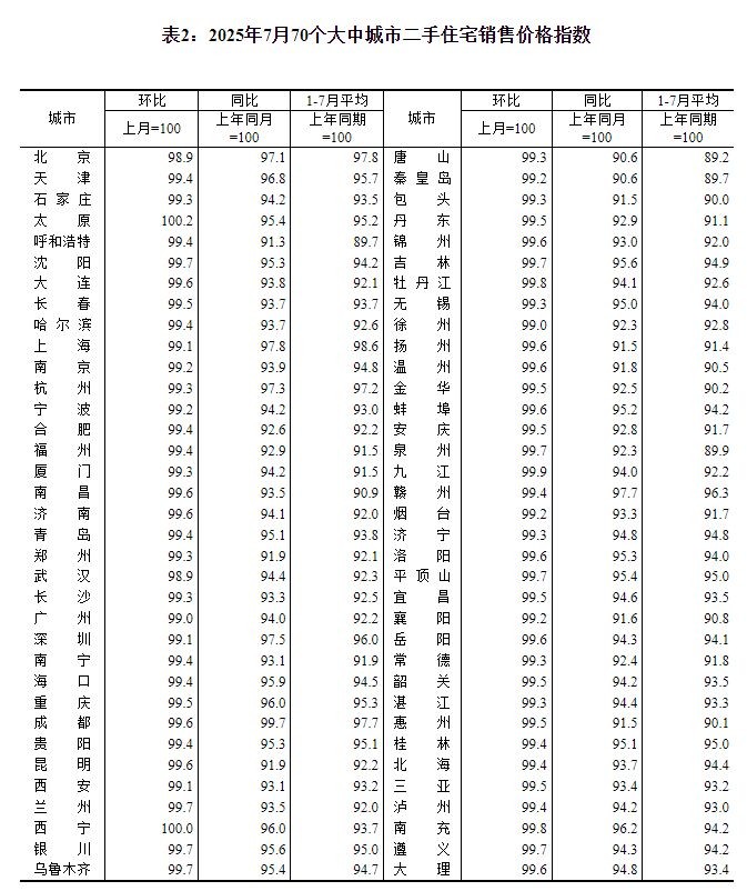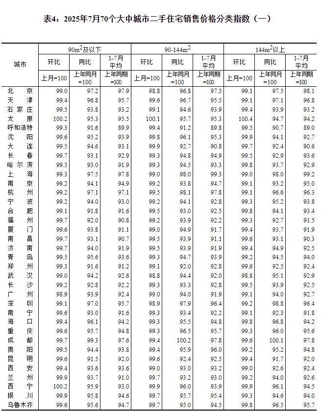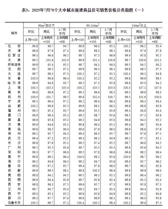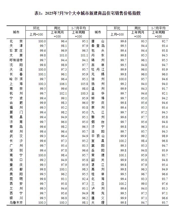 据国家统计局网站8月15日消息,国家统计局公布数据,2025年7月份,70个大中城市中,各线城市商品住宅销售价格环比下降,同比降幅整体有所收窄。
