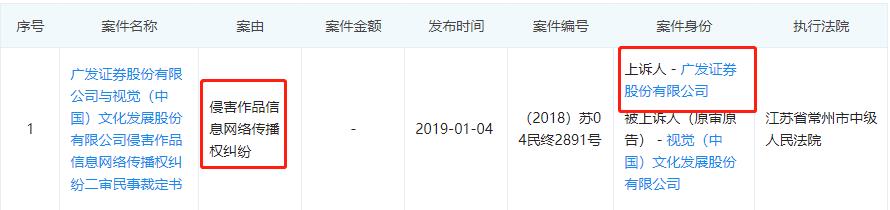其中,“新鲜出炉”的诉讼就是,广发证券与它关于侵害作品信息网络传播权纠纷的案件。最新进展显示,上诉人广发证券因与被上诉人视觉中国发展侵害作品信息网络传播权纠纷一案,不服江苏省常州市武进区人民法院(2018)苏0412民初515号民事判决,向法院提起上诉。