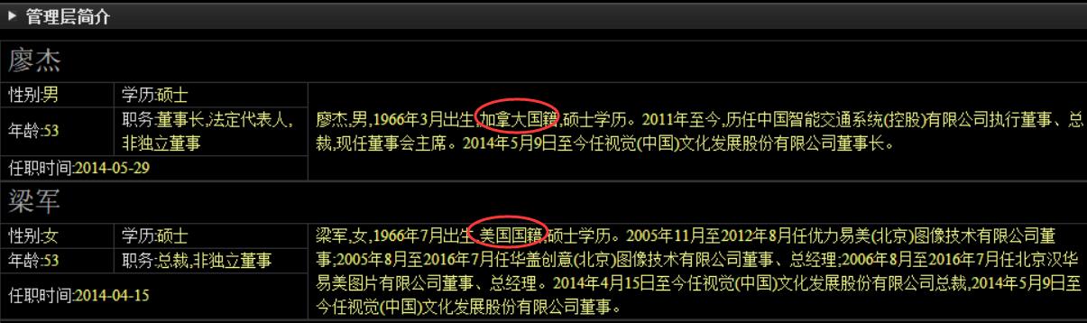 而这些高管的共同点是,大部分都拥有外国国籍。公开资料显示,视觉中国董事长廖杰目前为加拿大国籍,其于2014年5月起担任公司董事长一职。此外,梁军目前为美国国籍,其自2014年4月起担任公司总裁一职。