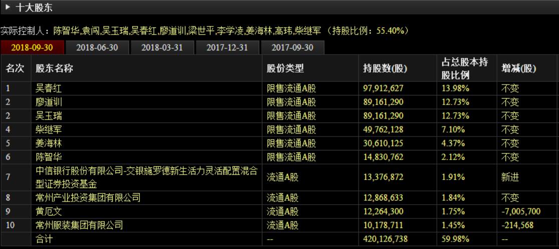 截至2018年3季末,10人合计持有公司55.40%的股份;其中吴春红、廖道训、吴玉瑞、柴继军和梁世平为“十名一致行动人”的主要成员,共持有公司股份的 46.61%。具体看,第二大股东廖道训和第三大股东吴玉瑞为董事长廖杰的父母;第一大股东吴春红为总裁梁军的母亲;梁军为梁世平的妹妹。