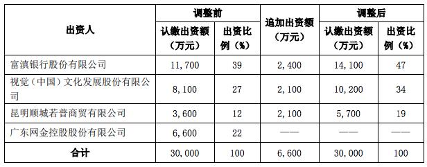在去年12月,视觉中国与富滇银行股份有限公司、广东网金控股股份有限公司及昆明顺城若普商贸有限公司协商一致,拟签署补充协议对富银消费金融公司的持股比例进行调整,并相应追加认缴出资额,出资方式均为货币出资,其中视觉中国拟追加出资额2100万元人民币。