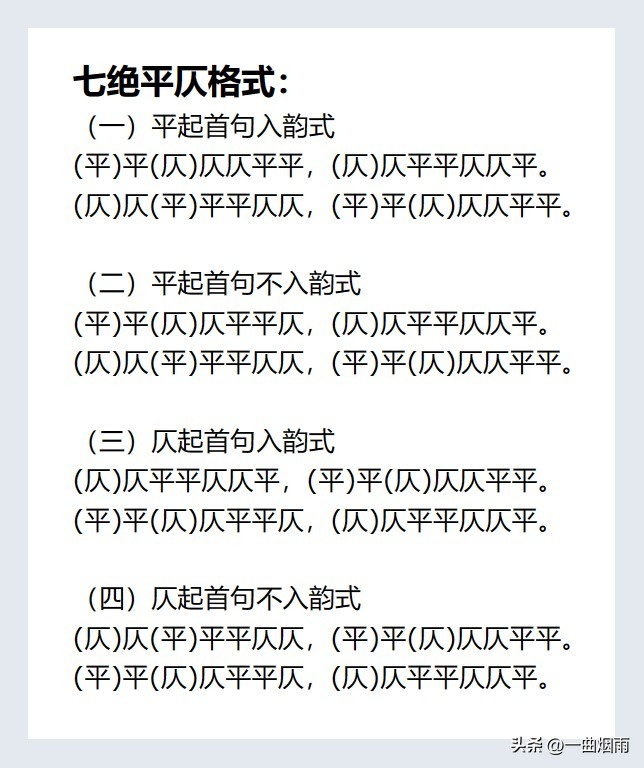 平起平收——平起首句押韵式:首句平声字起头,押韵。平起仄收——平起首句不押韵式:首句平声字起头,不押韵。仄起平收——仄起首句押韵式:首句仄声字起头,押韵。仄起仄收——仄起首句不押韵式:首句仄声字起头,不押韵。