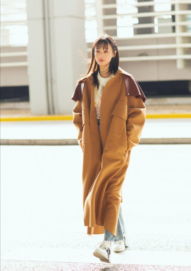 棕色的呢子大衣,浅蓝色牛仔裤,小白鞋穿在郑爽身上更加青春活力,像不像韩剧中青春开朗的学生女主角呢。