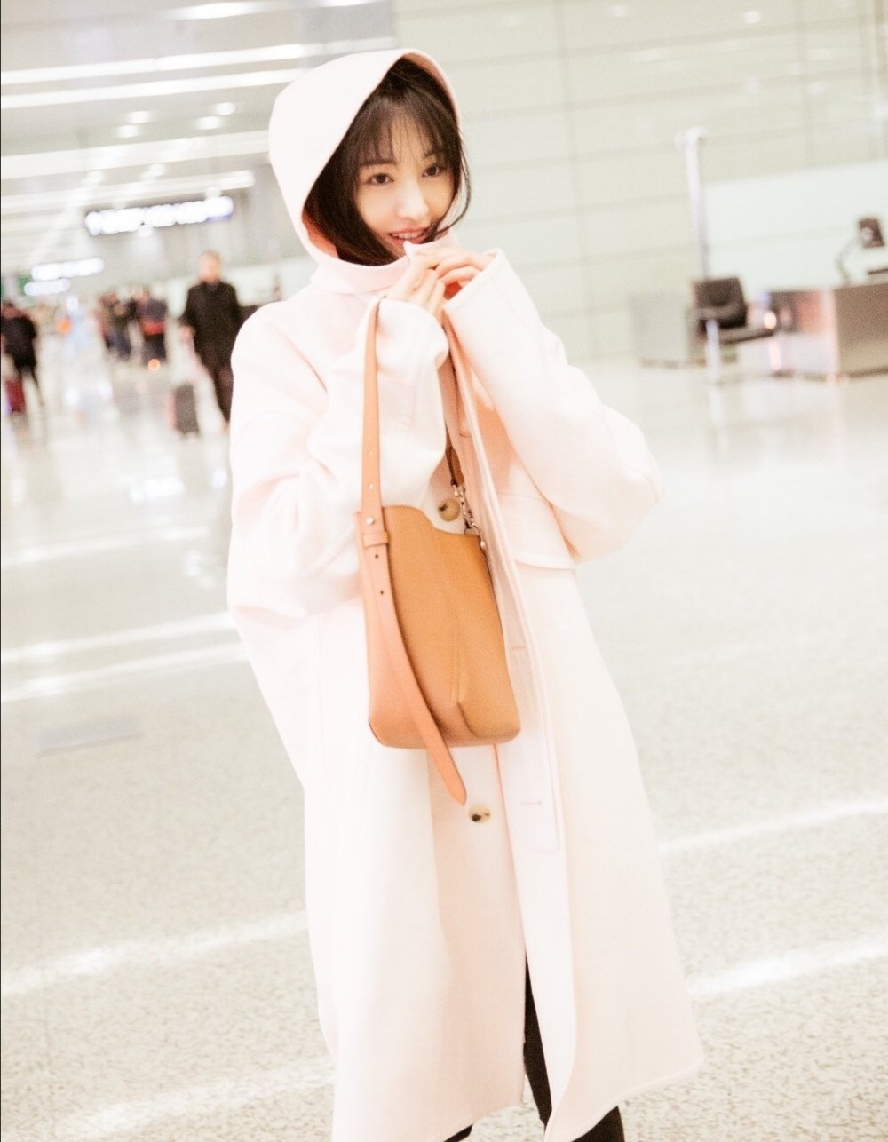 粉色大衣搭配一个棕色的水桶包,真的甜美又干净,像邻家妹妹一样可爱。