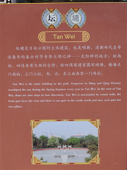 日坛是北京著名文物古迹五坛之一,始建于明代1530年,是明清两代帝王朝拜太阳神的地方。坛西向,四周是圆形围墙,四面有棂星门,西门外有燎炉、瘗池;北门外有神库、神厨、宰牲亭、钟楼、具服殿。