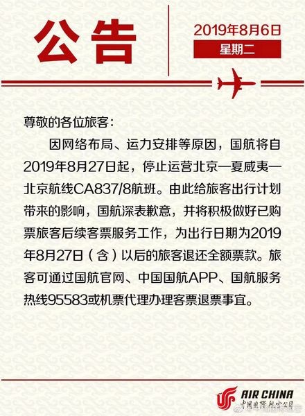 国航公告称,因网络布局、运力安排等原因,国航将自2019年8月27日起,停止运营北京—夏威夷—北京航线CA837/8航班。由此给旅客出行计划带来的影响,国航深表歉意,并将积极做好已购票旅客后续客票服务工作,为出行日期为2019年8月27日(含)以后的旅客退还全额票款。旅客可通过国航官网、中国国航APP、国航服务热线95583或机票代理办理客票退票事宜。