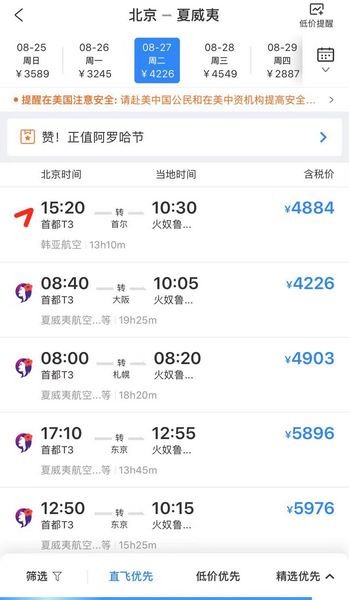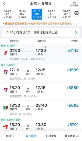 北青报记者查询票务软件发现,国航目前仍有票在售的最后一班北京—夏威夷的航线实际上是8月25日的,经济舱票价在票务软件上为6142元,全程9小时40分。而同日中转首尔的外航北京—夏威夷的票价为3589(含税),全程13小时5分钟。不过,在国航取消该航线后,东航还有一条从上海直飞夏威夷的航线。