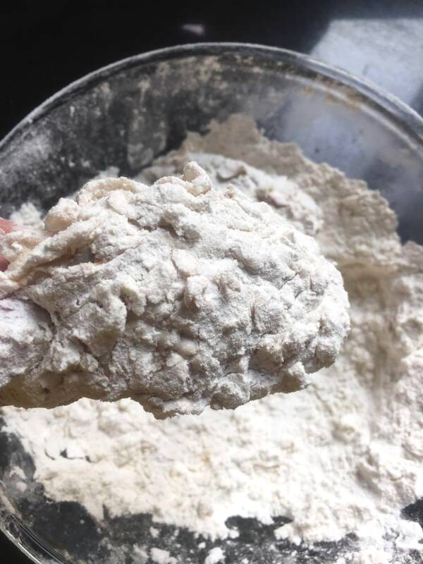 (4)放入面粉中重复第一次的按压手法,将鸡翅抖干净。