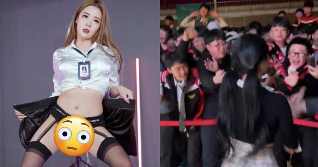乐队离开舞台向观众致意,其中许多人看起来很年轻,穿着制服。 其中一名成员甚至在一名学生面前摆出性感的姿势。