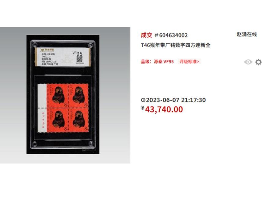 6月7日,一套源泰评级VF95分T46金猴带厂铭数字四方连以43,740元成交。