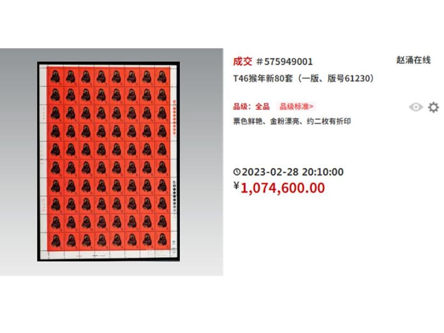 这套猴票面值8分,整版80枚面值6.4元。近期,整版猴票拍出1,074,600元的高价!百万级珍邮,远超面值几十万倍,在收藏界受欢迎程度有目共睹!