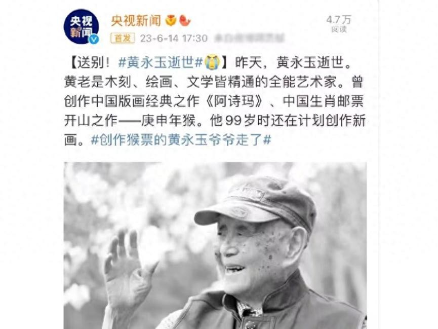 2023年6月13日凌晨3点43分,著名艺术家、“猴票之父”黄永玉先生逝世。