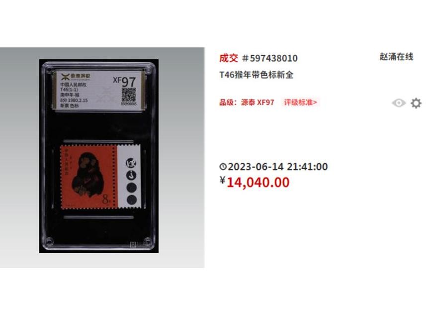 6月14日,一枚源泰评级XF97(冠军分)T46金猴带色标邮票以14,040元成交。