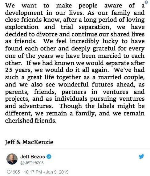 1月9日,杰夫·贝佐斯于以双方的名义发布推文,公布离婚消息。
