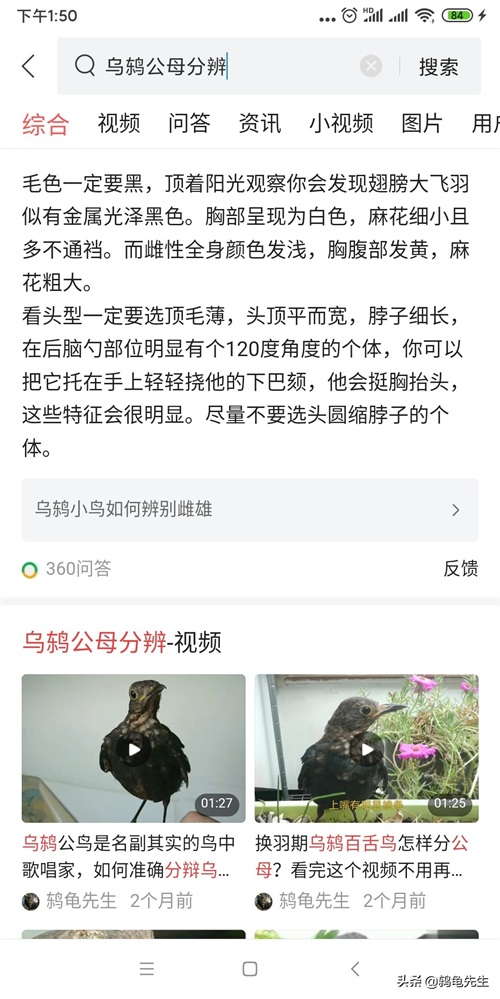 更多关于乌鸫公母分辨的方法和信息,鸫龟先生建议大家,直接用今日头条app上方的搜索框输入“乌鸫公母分辨”,点击搜索,即有大量详尽的文字、图片及视频等分辨方法。