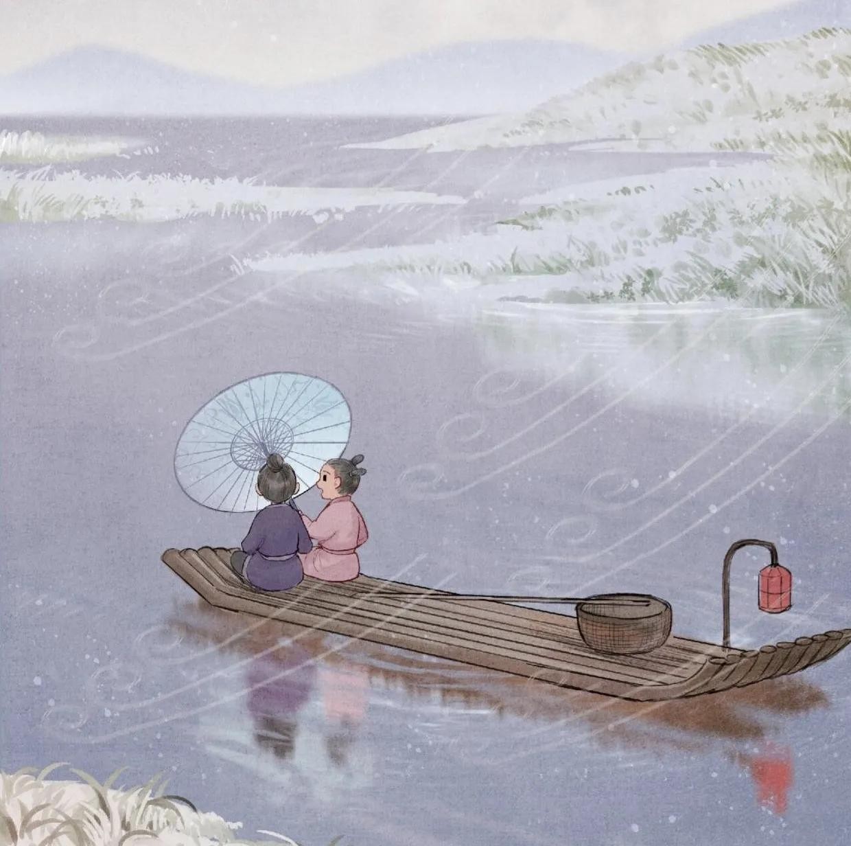 一只渔船上,两个小孩儿收起竹篙,放下船桨,坐在小船中。