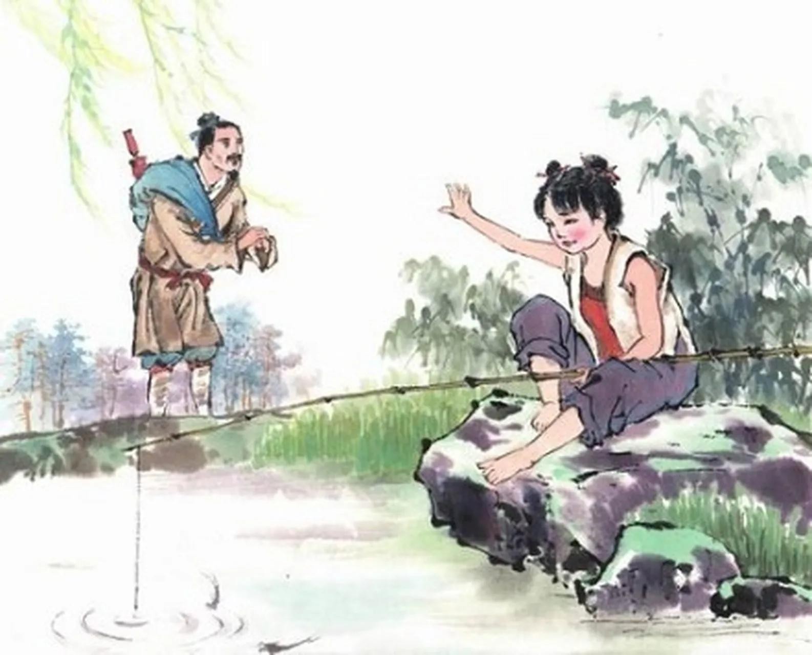 听到有过路的人向他问路,小孩赶忙远远地摆摆手,生怕话音惊动了水里的鱼儿,不敢回应过路人。