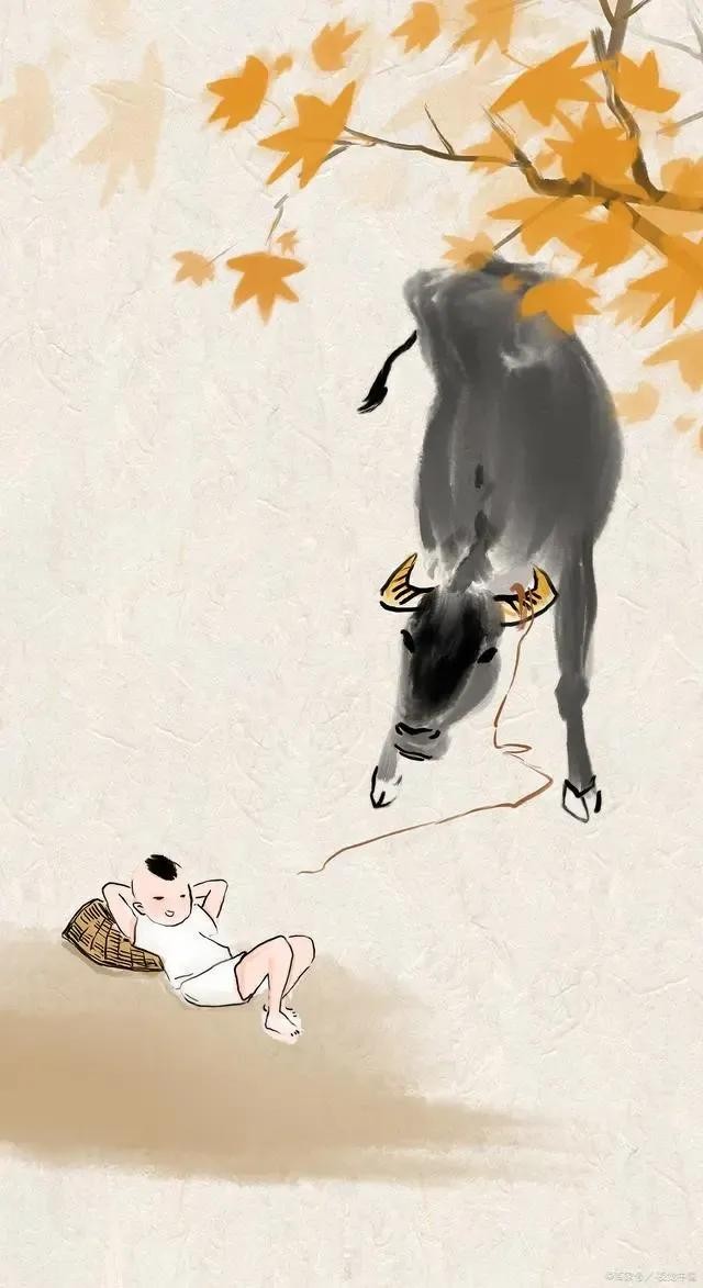 放牛的牧童横骑在牛背上,在夕阳余辉下缓缓地归家。他手拿一支短笛,没有腔调地信口乱吹着。