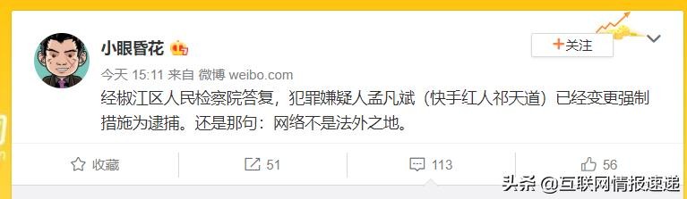 近日微博有网友爆料称,经椒江区人民检察院答复,犯罪嫌疑人孟凡斌(即快手红人祁天道的真名)已经变更强制措施为逮捕。