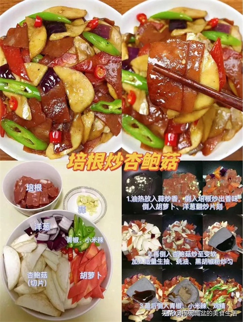 准备食材:培根、蒜片、洋葱、杏鲍菇片、胡萝卜片、青椒、小米辣。
