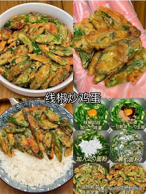 线椒切段,加入一个鸡蛋、一勺十三香、一勺蚝油、一勺生抽、两勺面粉,搅拌均匀。