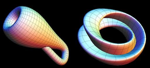 说到纬度,大家应该都听过这样两个概念:莫比乌斯环与克莱因瓶。前者是三维欧几里得空间中一种奇特的二维单面环状结构,后者是则是第四维度的产物,将其切成两半,会产生两个莫比乌斯环。