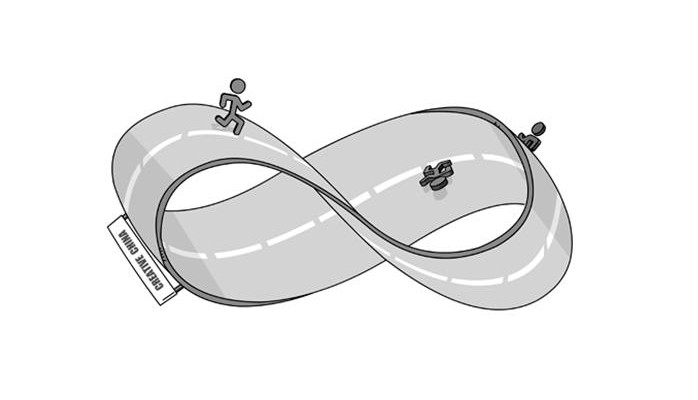 在莫比乌斯环中,是无法选择“向上”或“向下”的,沿着它走,最终会在开始的同一点结束,但“上”变成了“下”。