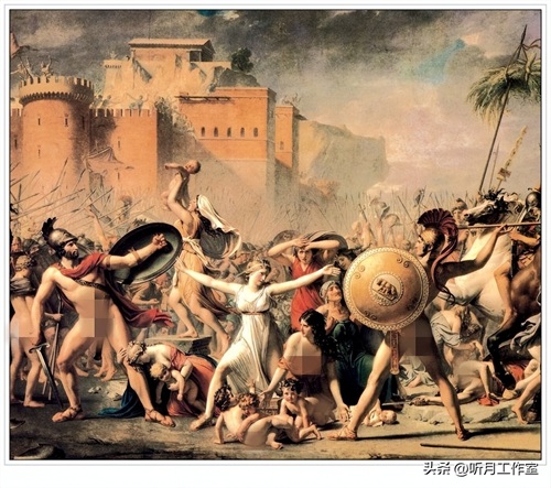 法国画家达维特《萨宾妇女的干预》布面油画,纵385厘米横522厘米,1799年作,法国卢浮宫藏。该画以罗马人与萨宾人的冲突为背景,描绘了美丽勇敢的艾埃茜妮挺身而出阻止战争,身后妇女高举婴儿呼吁和平。此画不仅纪念了达维特的妻子,也呼吁人民在革命后重新团结,追求和平。