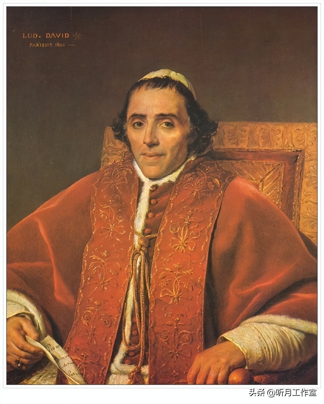 法国画家达维特《教皇皮尤斯七世》布面油画,1805年作,法国卢浮宫藏。这幅画展现了达维特精湛的技艺和对新古典主义的深刻理解,是其在艺术生涯中的又一力作。