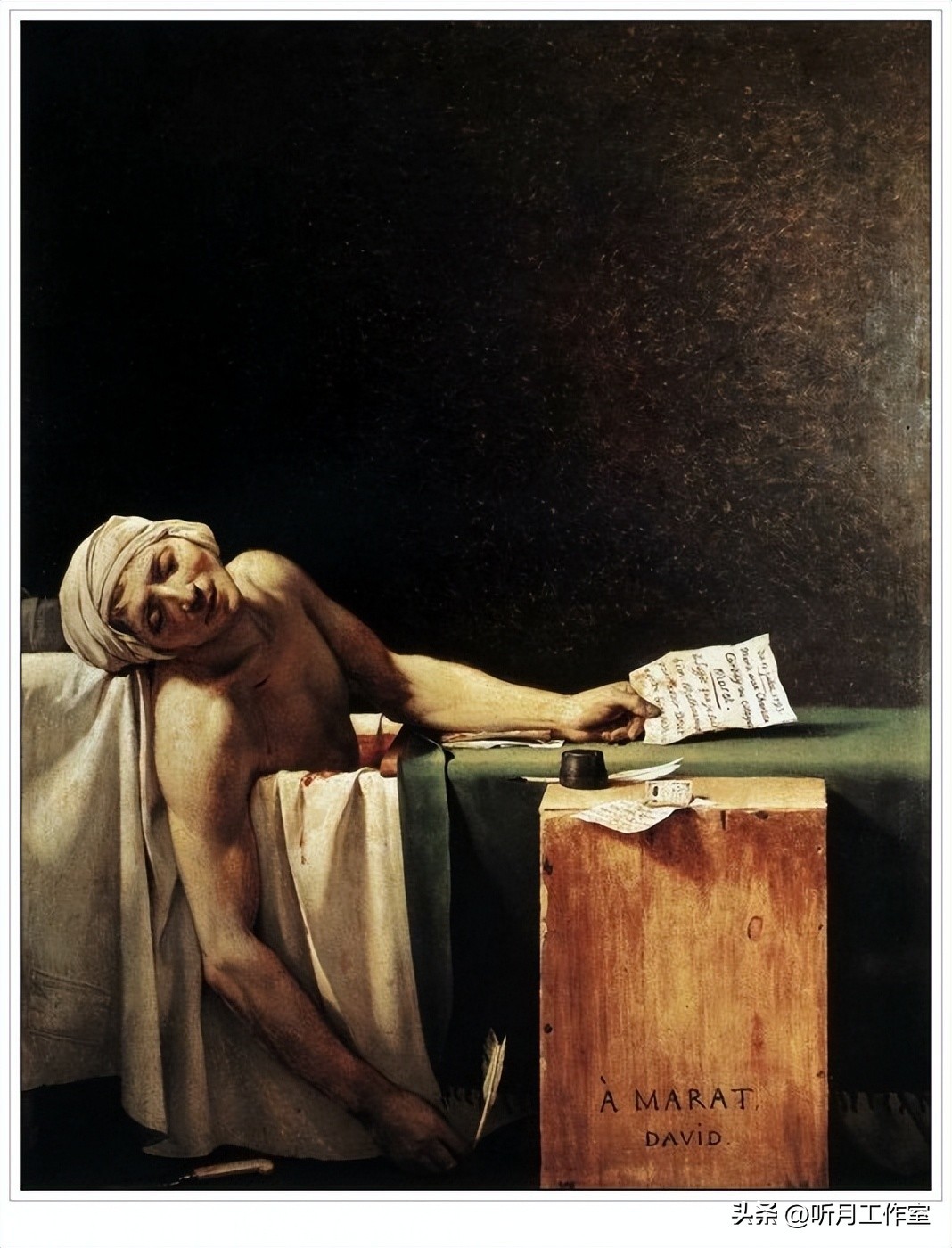 法国画家达维特《马拉之死》油画,纵165厘米横128厘米,1793年作,比利时皇家美术博物馆藏。描绘了法国革命家马拉被刺杀、死在浴缸中的场景。画中马拉形象理想化,省略了皮肤问题,但保留了真实细节如绿色围毯、纸张和笔。大卫以此画悼念马拉,将其塑造成革命“殉道者”。