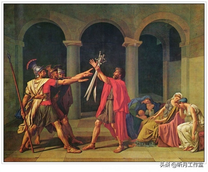 法国画家达维特《吹响为民族抗战的号角》布面油画,纵330厘米横425厘米,1784年作,法国卢浮宫藏。描绘贺拉斯三兄弟向父亲老贺拉斯宣誓效忠祖国的场景,构图对称均衡,人物动势强健有力,背景为罗马建筑大厅,营造出庄严神圣的气氛。