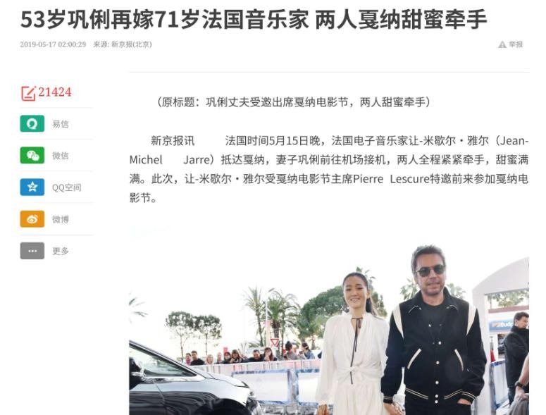 新京报:53岁巩俐再嫁71岁法国音乐家 两人戛纳甜蜜牵手
