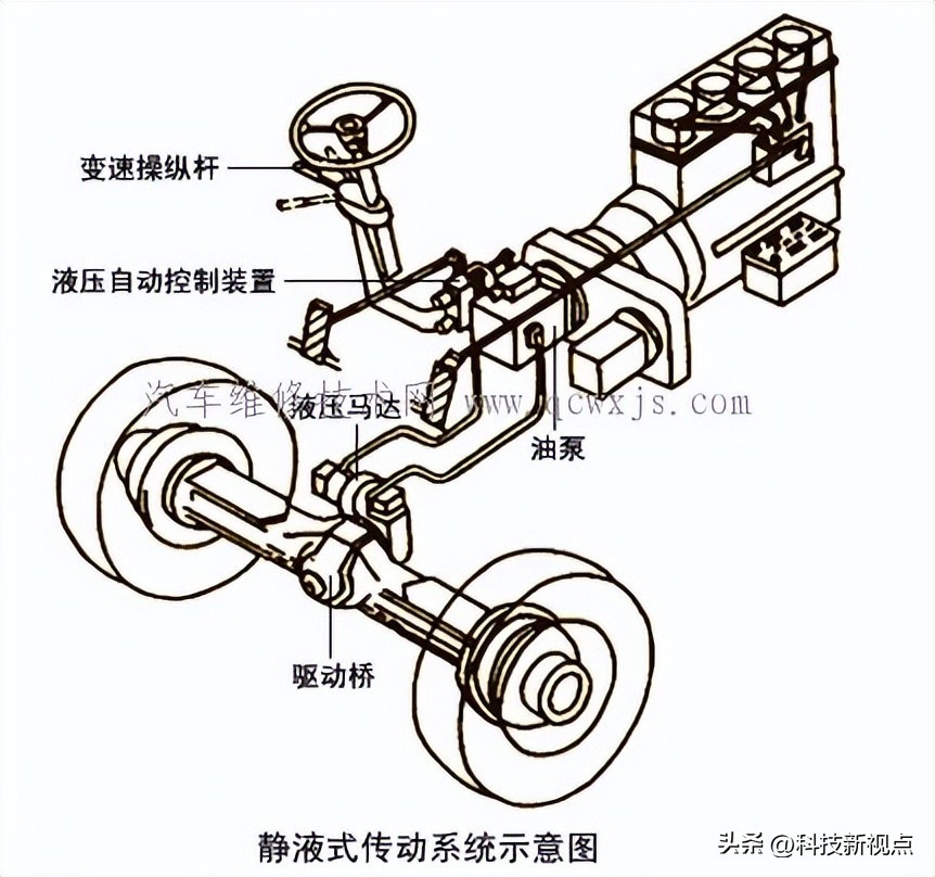 静液式传动系又称容积式液压传动系。主要由油泵、液压马达和控制装置等组成。发动机的机械能通过油泵转换成液压能,然后由液压马达再又转换为机械能。
