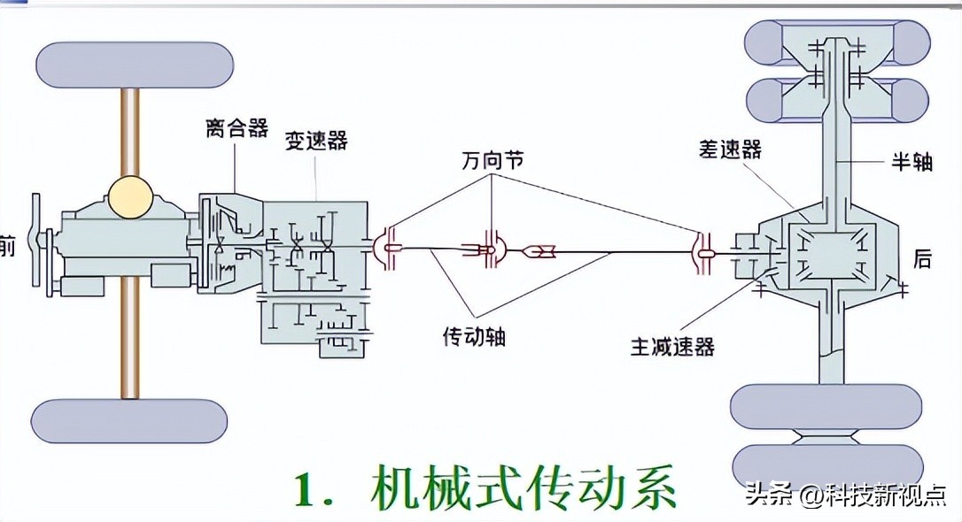 机械式传动系结构简单、工作可靠,在各类汽车上得到广泛的应用.其基本组成情况和工作原理:发动机的动力经离合器、变速器、万向节、传动轴、主减速器、差速器、半轴传给后面的驱动轮。并与发动机配合,保证汽车在不同条件下