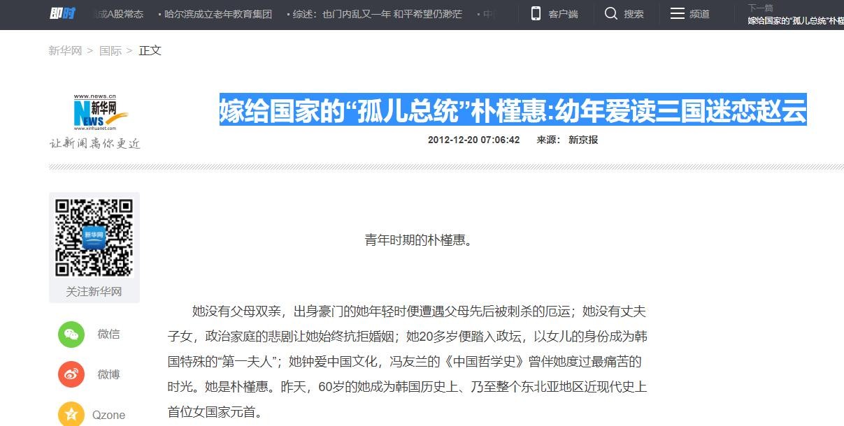 1,《嫁给国家的“孤儿总统”朴槿惠:幼年爱读三国迷恋赵云》新华网