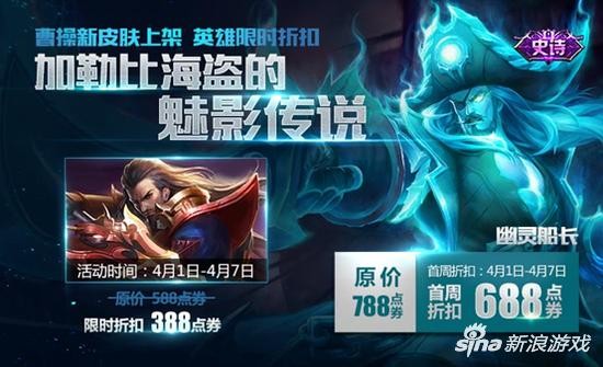 王者荣耀曹操幽灵船长皮肤将于4月1日正式和大家见面,这款传说级别的皮肤售价也是意料之中的788点卷,不过在上线的首周购买我们还是可以享受一定的优惠的,4月1日~4月7日购买幽灵船长皮肤仅需688点卷哦。