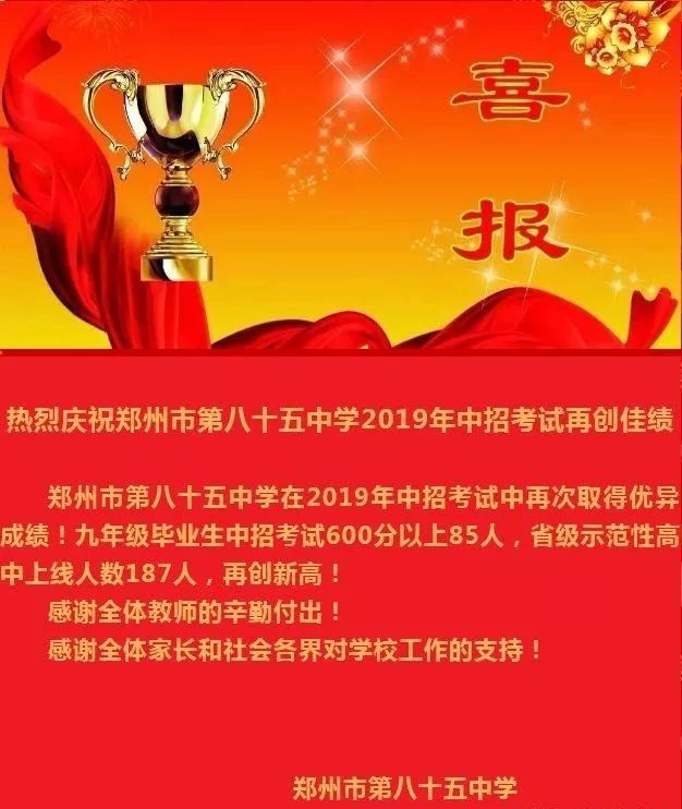 郑州市第八十五中学2019年中招成绩中,600分以上85人,达到省示范性高中分数线(575分)人数187人。