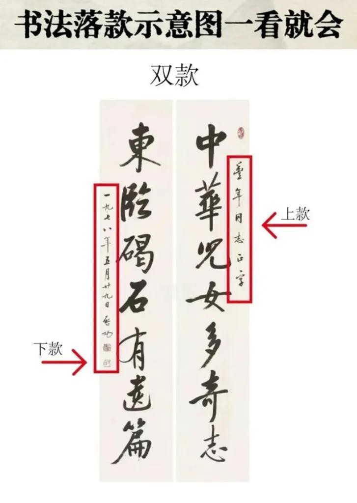 落款格式:分为单款和双款。单款仅包含书写者的姓名、创作时间等信息;双款则还包括受赠者的姓名、称谓等。