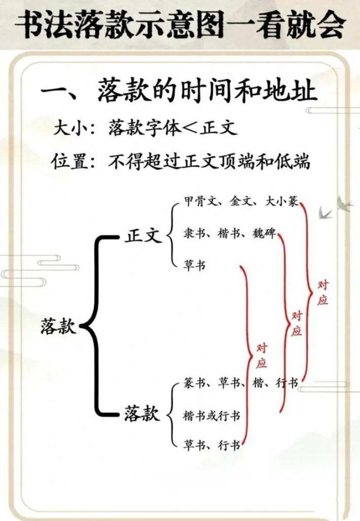 字体要求:落款字体一般小于正文字体,且需与正文协调。如正文为篆书,落款可用篆书、章草、楷书或行书。