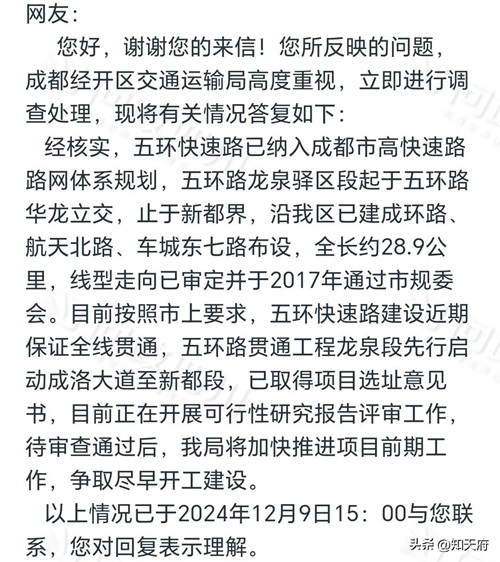 目前新都区正开展五环路新都段前期工作,因五环路新都段主要为新建路段,涉及土地利用总体规划等问题,需经过申报审批后将适时启动建设。