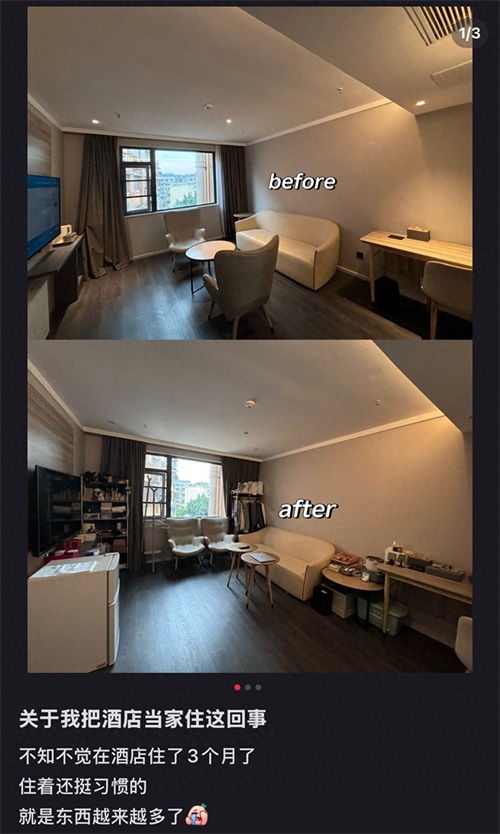 在社交平台上,有不少人“晒”出了自己长租酒店的攻略。有人自制了简易衣架做成便携式小衣柜,有人分享自己铺上的家用四件套,还有人整理出详细的“酒店长租房怎么谈”,帮网友们筛选合格的酒店,相关话题的浏览量已达几百万。