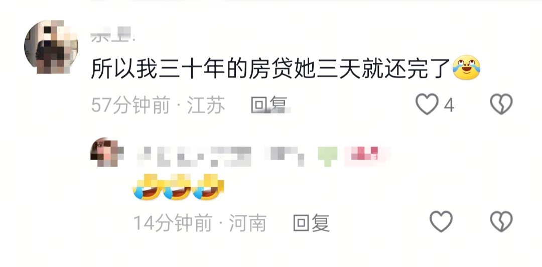 网友羡慕的表示,自己三十年的房贷,用顾茜茜的收入来比较,几天就可以还完。