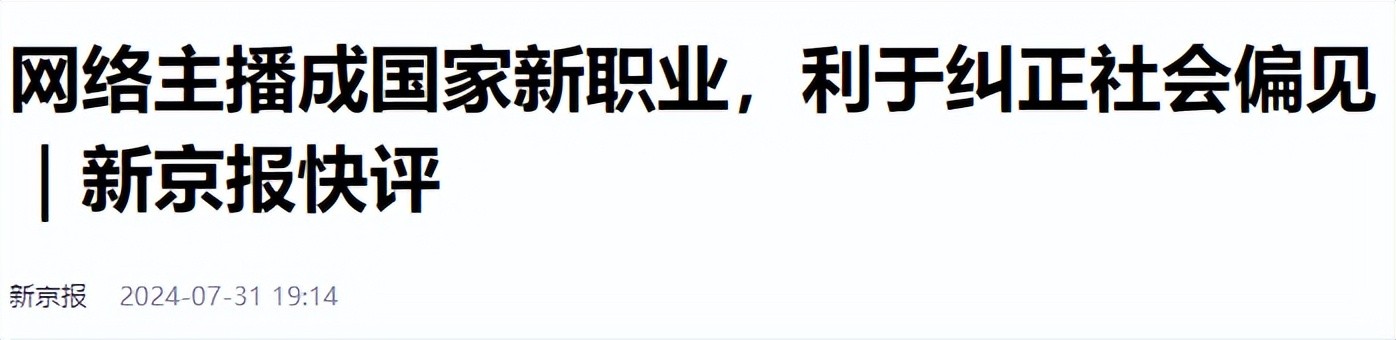 信息来源:新京报--网络主播成国家新职业,利于纠正社会偏见|新京报快评--2024-07-31