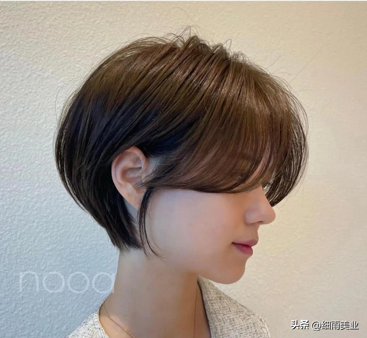 超短发发型显俏皮可爱,非常的活泼。整体发型的纹理走向自然有型,打理简单,百搭又上镜,减龄瘦脸,搭配棕色的发色,让发型看起来更加清新活力。
